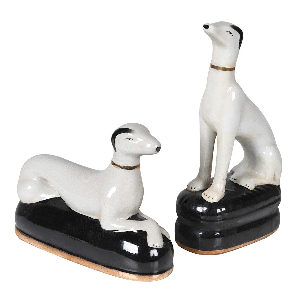 The Shelbourne Pair is a charming set of whippet ornaments designed to bring a little character and elegance to the room. With one standing and one sitting, they make a lovely decorative duo for a console table, mantelpiece, bookshelf, or sideboard where you want something playful, stylish, and easy to place.