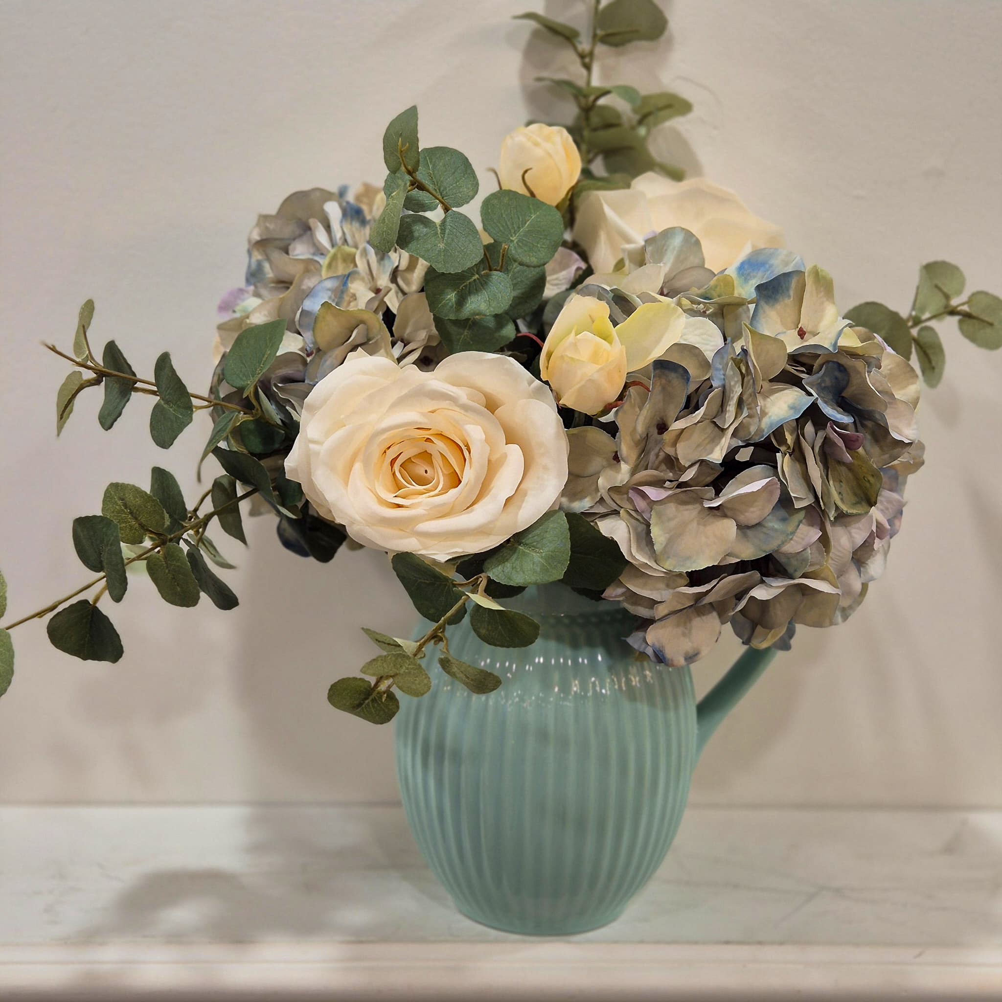 Juliet feels effortless. The gentle tones of the roses combined with the soft movement of eucalyptus create a fresh, natural look that brightens a space instantly. The sage jug adds a subtle country touch while keeping the overall feel refined and modern.