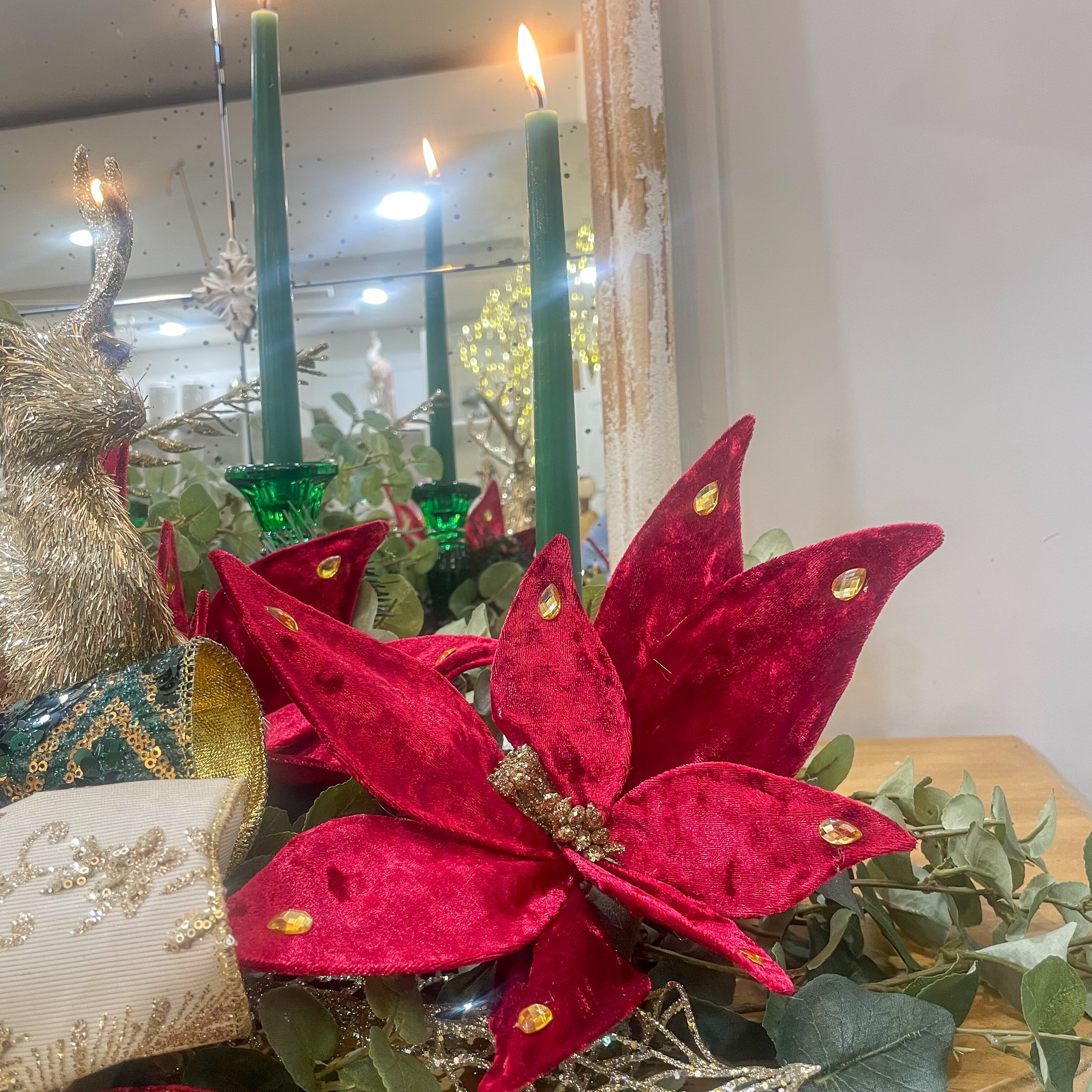 To complete the look, the Glencullen Luxury Garland is styled with six emerald-green glass candle holders and six matching green tapered LED candles, adding that soft evening glow without the worry of open flame.