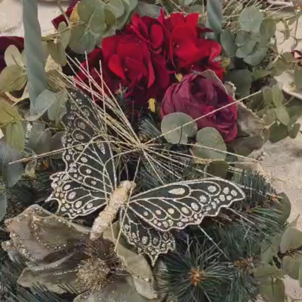 This magnificent 1.8m garland is a true original designed and handcrafted by Collette in her workshop at Lily Bloom. It brings together a sumptuous blend of luxurious ribbons, burgundy silk flowers, rich berries, and generous eucalyptus, all finished with sparkling gold foliage and two of our signature gold stags.