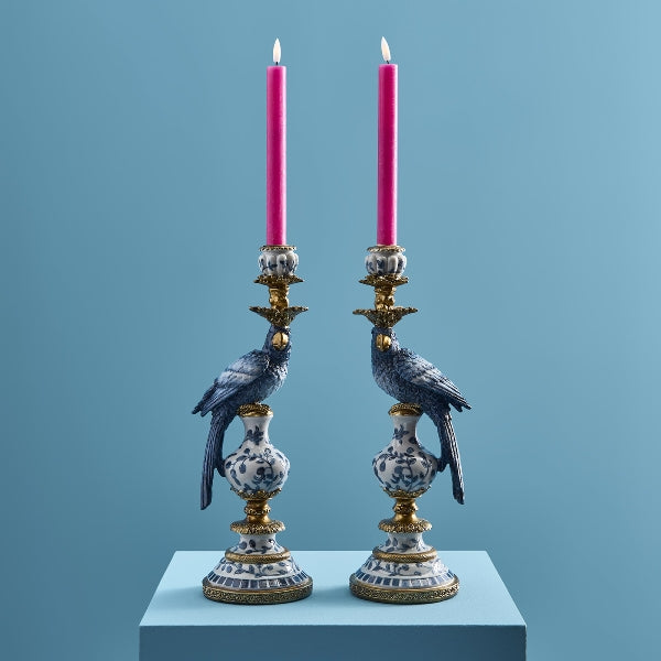There’s something wonderfully uplifting about this piece. The sculpted parrot adds character and movement, while the blue and white palette keeps the look refined and fresh. Style her alone for impact, or pair with complementary candle holders at varying heights for a more curated, designer feel. Once the taper candle is lit, she casts a magnificent, warm glow that instantly softens the room.